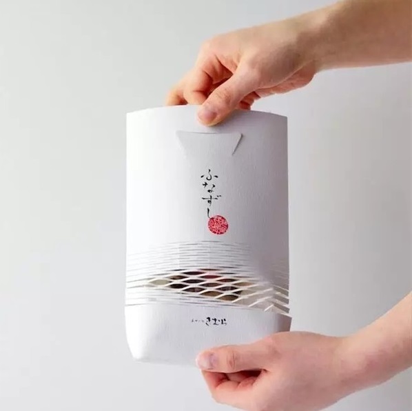 紙袋中放入物品后上下拉成網狀,形態既像漁網又像魚鱗,在包裝 FUNAZUSHI時,可以透過網看得到里面裝的魚肉,提手設計成魚尾鰭的形狀,與“魚鱗”結構、袋里魚肉相呼應,看起來真的像一條魚!拎著它,曉包還可以想象自己拎了一個漁網,裝著是剛剛出海歸來打上來的魚呢。